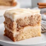 You can bake the cake and prepare the cinnamon drizzle a day in advance. Once you’ve poured the cinnamon mixture over the cake and it has cooled, cover it and refrigerate overnight. Prepare the frosting fresh on the day of serving for best texture.