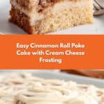 Keywords: Cinnamon roll poke cake, easy poke cake recipe, vanilla cake with cinnamon sauce, cream cheese frosting cake, homemade poke cake dessert