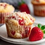 It’s best to use fresh strawberries for the topping to avoid extra moisture which can make muffins soggy. You can fold in frozen berries inside the batter, but thaw and drain them well first.