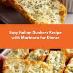 These Italian Dunkers are a quick and delicious snack featuring buttery, garlic-seasoned hot dog buns topped with melted mozzarella and Italian seasoning, perfect for dunking into rich marinara sauce.