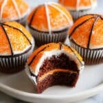 These Basketball Cupcakes are a fun and festive treat perfect for game day celebrations, featuring rich chocolate cupcakes decorated with orange sprinkles and black licorice laces to mimic basketball nets.