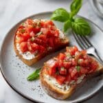 This easy and fresh Bruschetta with Goat’s Cheese recipe combines succulent ripe tomatoes with creamy goat’s cheese on toasted sourdough bread, enhanced by fragrant basil, olive oil, and a hint of garlic. Perfect as an appetizer or light snack, it comes together in just 15 minutes and serves 4.
