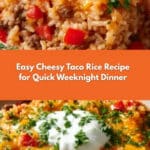 Keywords: Cheesy Taco Rice, easy taco rice recipe, one-pan taco rice, ground beef rice skillet, Mexican rice dinner