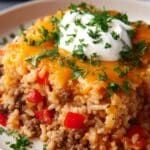 This Cheesy Taco Rice recipe combines savory ground beef, flavorful taco seasoning, and melted cheese with tender rice to create a comforting and easy one-pan meal perfect for busy weeknights.