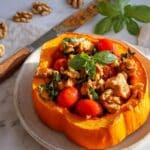 This Chicken Walnut Stuffed Pumpkin features a tender roasted pie pumpkin filled with a savory mixture of chicken, toasted walnuts, fresh herbs, and tomatoes for a comforting and flavorful meal perfect for cozy gatherings.