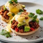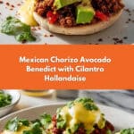 A bold Mexican twist on classic eggs Benedict featuring spicy chorizo, creamy avocado, poached eggs, and zesty cilantro hollandaise sauce served on toasted English muffins for a hearty and flavorful breakfast or brunch.