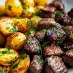 Savor the rich flavors of tender sirloin steak bites cooked in creamy garlic butter alongside golden, herb-seasoned Yukon gold potatoes for a comforting and delicious meal.
