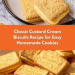 Classic homemade custard cream biscuits featuring crisp buttery cookies sandwiched with a smooth, creamy custard-flavored buttercream filling. These delightful biscuits are perfect for teatime or as a sweet snack and are made from simple pantry ingredients with easy baking techniques.