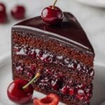 Keywords: Dark Forest Cake, vegan chocolate cake, cherry filling, black chocolate ganache, plant-based dessert