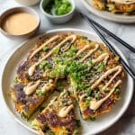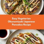 This easy vegetarian Okonomiyaki recipe brings the flavors of Japan to your kitchen with crispy savory pancakes loaded with cabbage, scallions, and a tangy vegan sauce topping.