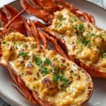 To reheat leftovers, gently warm the lobster mixture in a skillet over low heat so it doesn’t curdle or toughen. Then spoon it back into the shells, add a light sprinkle of cheese if desired, and bake briefly until heated through and bubbly.
