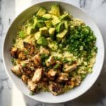 - Assemble the Salad: In a large mixing bowl, combine the cooked orzo, sliced grilled chicken, diced avocado, halved cherry tomatoes, crumbled feta cheese, thinly sliced red onion, and chopped cilantro or parsley.