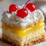 This Hawaiian Pineapple Cake Delight combines moist vanilla cake infused with a sweet pineapple topping, layered with creamy vanilla pudding and whipped topping, then garnished with toasted coconut, pineapple slices, and maraschino cherries for a tropical treat.
