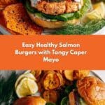 Keywords: healthy salmon burger, grilled salmon burger, easy salmon burgers, seafood burgers, caper mayo salmon burger