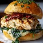 This Irresistibly Creamy Marry Me Chicken Sandwich with Sun-Dried Tomatoes features tender chicken breasts simmered in a rich, garlicky cream sauce with sun-dried tomatoes, served on toasted artisan rolls for a flavorful and satisfying meal.