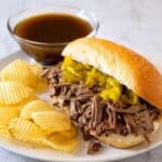 This Italian Beef recipe features a tender, slow-roasted chuck roast infused with garlic, oregano, and red pepper flakes, perfect for shredding and serving on hard rolls with flavorful dipping broth.