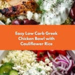 Keywords: low carb chicken bowl, Greek chicken bowl, grilled chicken recipe, cauliflower rice bowl, Mediterranean chicken bowl, healthy low carb meal