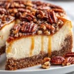 This indulgent Pecan Pie Cheesecake features a buttery graham cracker crust, creamy cheesecake filling, and a rich, homemade pecan pie topping, perfect for special occasions or holiday desserts.