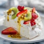This Perfect Pavlova recipe yields a light, airy meringue dessert with a crisp crust and a marshmallow-like center, topped with whipped cream and fresh fruits like kiwi, strawberries, mango, and passion fruit pulp or lemon curd. It’s an elegant Australian classic that is best served freshly assembled and makes a stunning centerpiece for any celebration.