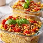 This vibrant Pesto Baked Orzo Meal Prep combines orzo pasta with a colorful medley of cherry tomatoes, chickpeas, sun-dried tomatoes, olives, and pesto, all baked to perfection for an easy and flavorful meal that’s great for prepping ahead.