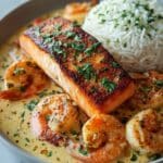 This Savory Cajun Salmon and Shrimp in Creamy Spinach Sauce recipe brings together perfectly pan-seared salmon and sautéed shrimp coated in a rich, velvety Cajun-spiced cream sauce with fresh baby spinach and melted Monterey Jack cheese, delivering a flavorful and satisfying meal in just 30 minutes.