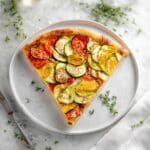 This Summer Ratatouille Pizza features a colorful arrangement of fresh summer vegetables atop a crispy pizza crust, enhanced with sun-dried tomato pesto and a flavorful garlic thyme olive oil drizzle. Perfect for a light and vibrant meal that celebrates seasonal produce.