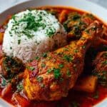 This flavorful Nigerian Chicken Stew served with tender rice combines spicy blended tomatoes, peppers, and aromatic herbs for a rich and comforting meal perfect for any occasion.