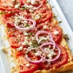 This Tomato Tart with Feta and Basil is a deliciously flaky puff pastry tart topped with thinly sliced seasoned tomatoes, crumbled feta cheese, red onion, and fragrant fresh basil. Perfect as a savory appetizer or light meal, the tart combines the bright acidity of tomatoes with creamy feta and a hint of red pepper flakes for a flavorful Mediterranean-inspired treat.