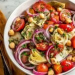 A fresh and vibrant Tuscan Artichoke Tomato Salad bursting with cherry tomatoes, marinated artichoke hearts, chickpeas, and fresh herbs, all tossed in a zesty vinaigrette. Perfect as a light lunch or a flavorful side dish, this no-cook salad comes together quickly and delivers a delightful Mediterranean flair.