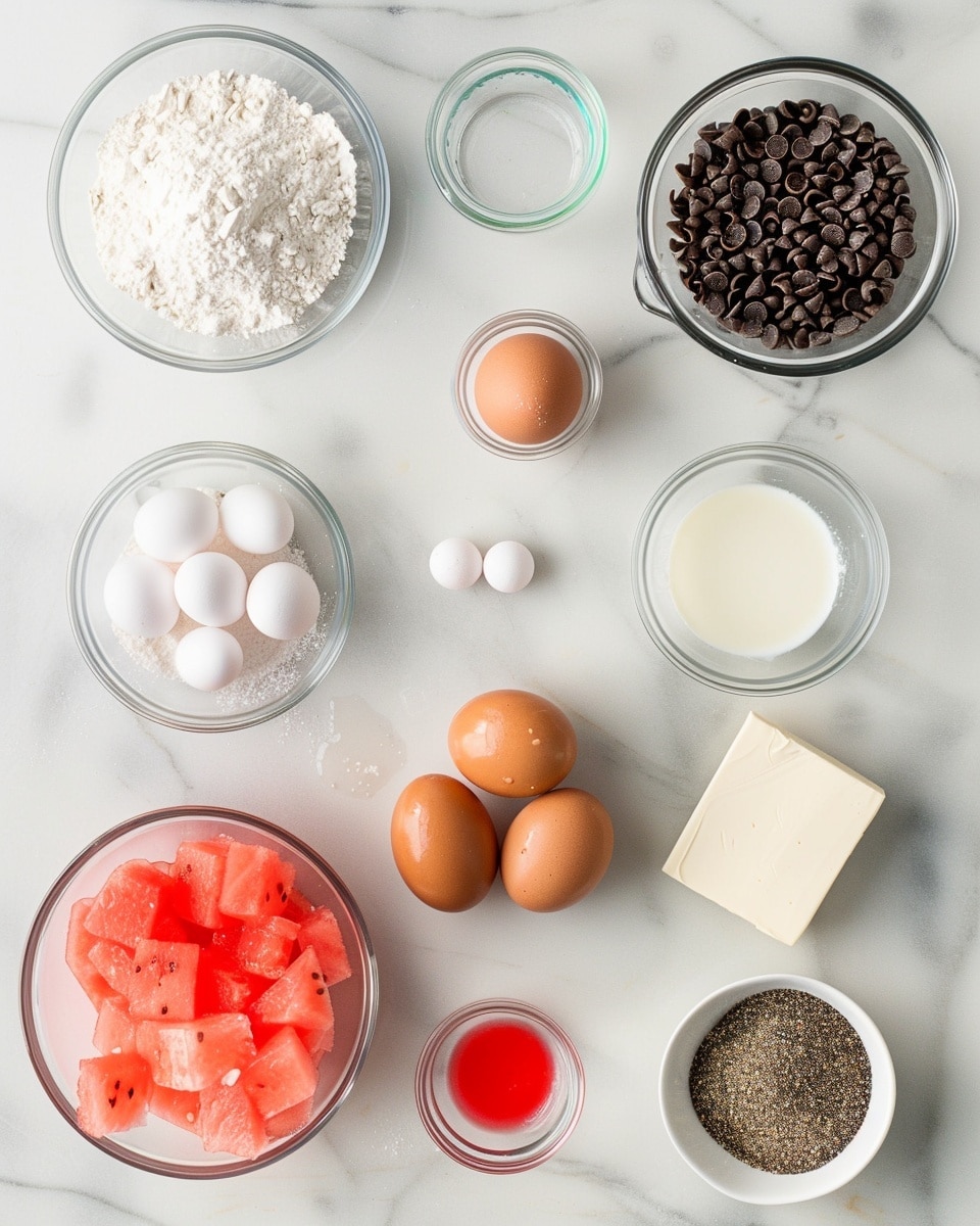 Gather your ingredients for this delightful watermelon-inspired treat, blending familiar staples with fun, colorful touches to transform a simple cake into a summer centerpiece.