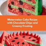 Keywords: Watermelon Cake, Watermelon gelatin cake, festive cake recipe, chocolate chip cake, buttercream frosting cake